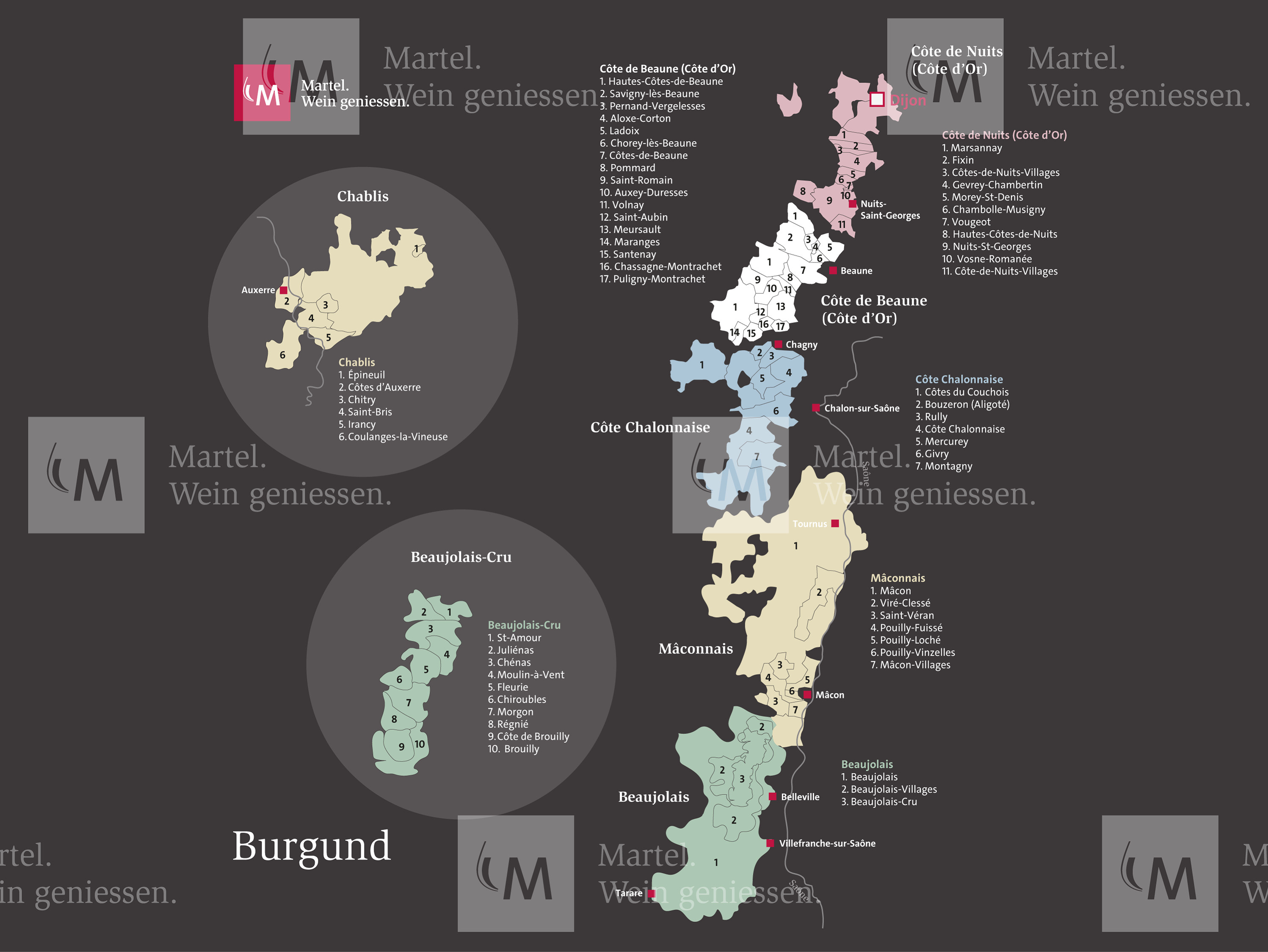 Die Region Côte ChalonnaiseDie nach der Stadt Chalon-sur-Sâone benannte Region Côte Chalonnaise liegt zwischen der Côte de Beaune und dem Mâconnais. Das Klima hier ist etwas trockener als an Côte de Beaune und Côte de Nuits und der Boden ist jenem der Côte d’Or ähnlich. Gepflanzt sind hauptsächlich Pinot Noir, Pinot Liébault und Gamay. Nur zu einem Viertel sind es die weissen Sorten Chardonnay und Aligoté. Unterteilt wird die Côte Chalonnaise in fünf Appellationen: Bouzeron (einzige Appellation im Burgund für Aligoté), Givry, Montagny, Rully und Mercurey (wohl die bekannteste Gemeinde). Es gibt 1er cru Lagen, jedoch keine Grand Crus.