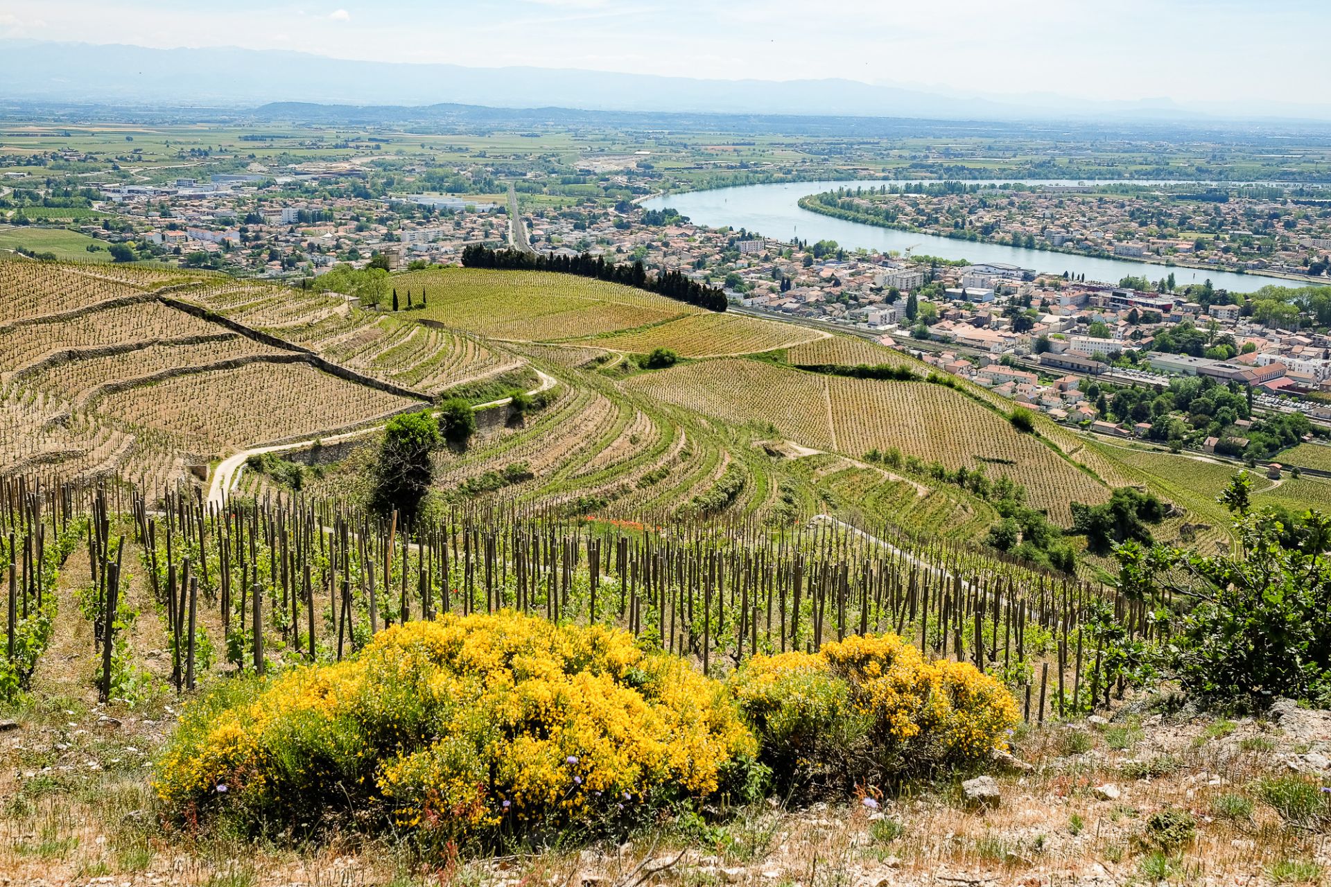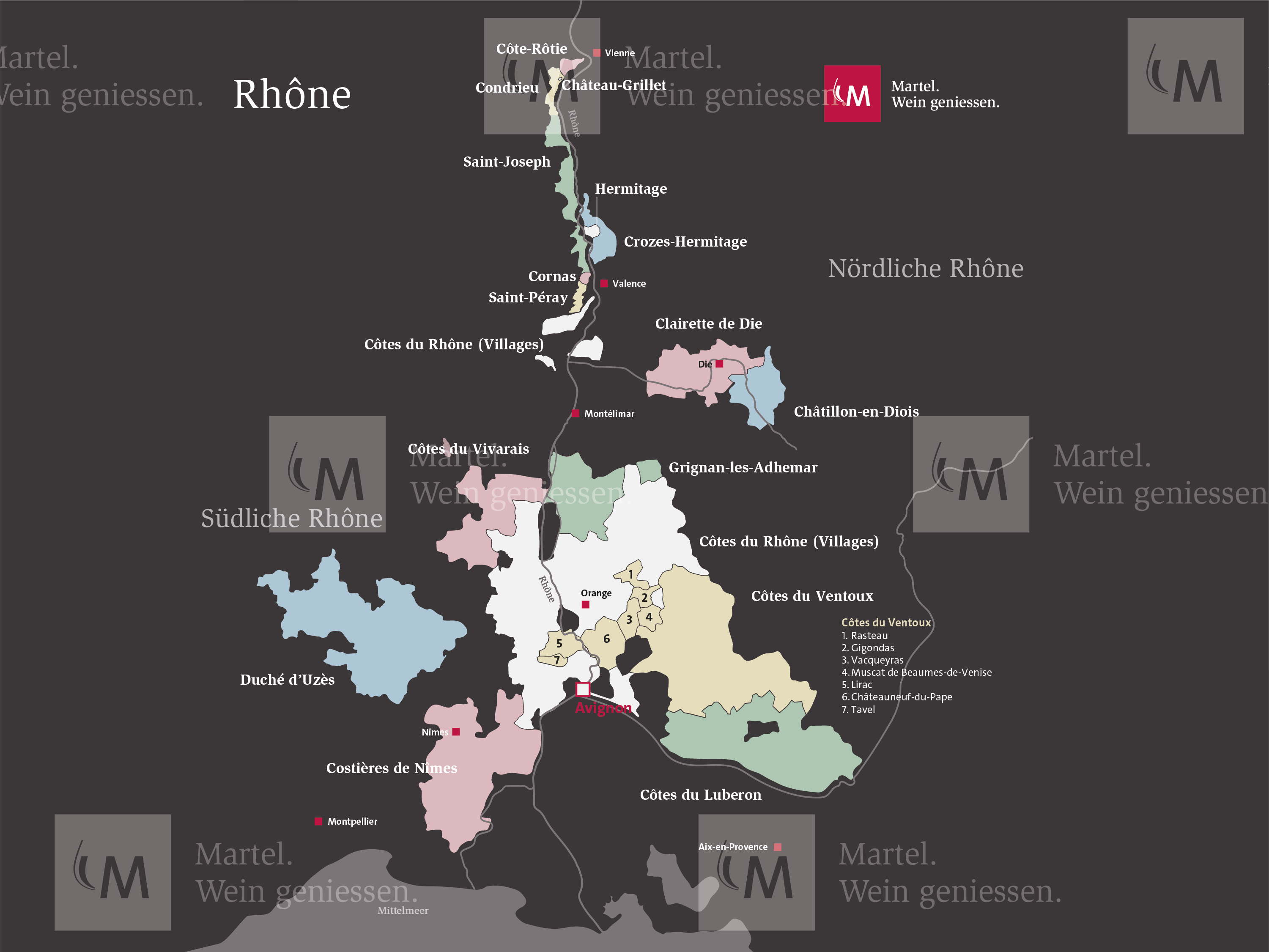 Die Weinbauregion Rhône erstreckt sich etwa 200 km von Lyon nach Süden bis Avignon hinunter. Beiderseits der Rhône und ihrer Nebenflüsse liegen knapp 60.000 Hektar Rebfläche, die über die sechs Départements verteilt und in vier Bereiche aufgeteilt sind. Mengenmässig weitaus am bedeutendsten ist die südliche Rhône (Rhône Méridional). Prestigeträchtiger aber ist die nördliche Rhône (Rhône Septentrional).