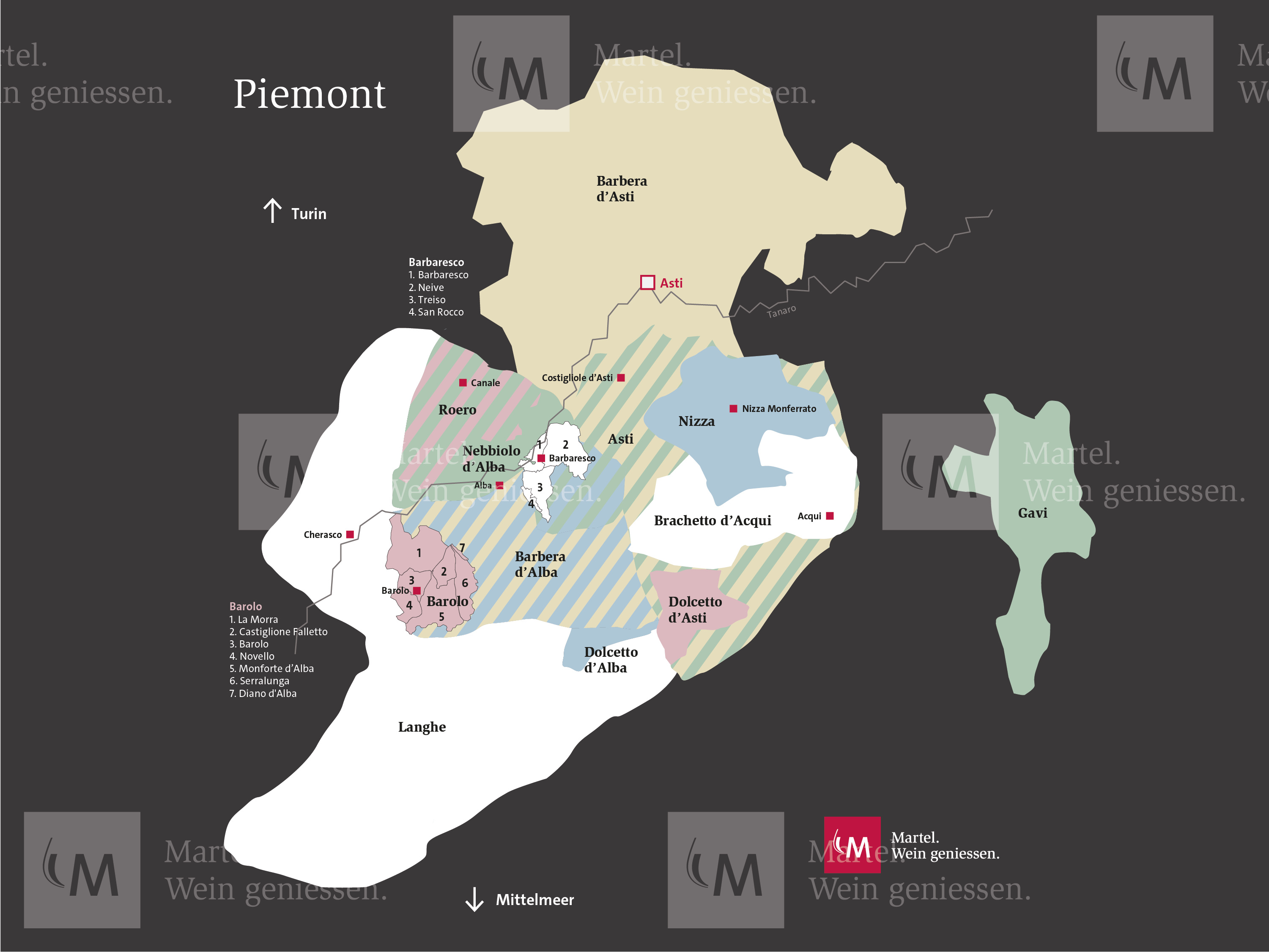 Das Piemont mit der Hauptstadt Turin ist die flächenmässige grösste italienische Region. Sie umfasst aber „lediglich“ 47'101 ha Rebfläche und liegt diesbezüglich „nur“ an sechster Stelle. Die Reben liegen meist in hügeligem Gebiet in sonnereichen Hanglagen, wofür die Einheimischen den Begriff Sori prägten. Die wichtigsten Weinbau-Gebiete sind Asti, Carema, Canavese, Caluso, die Vercelli- und Novara-Berge und die qualitativ als beste Lagen geltenden Hügel von Monferrato und Langhe bei Alba.