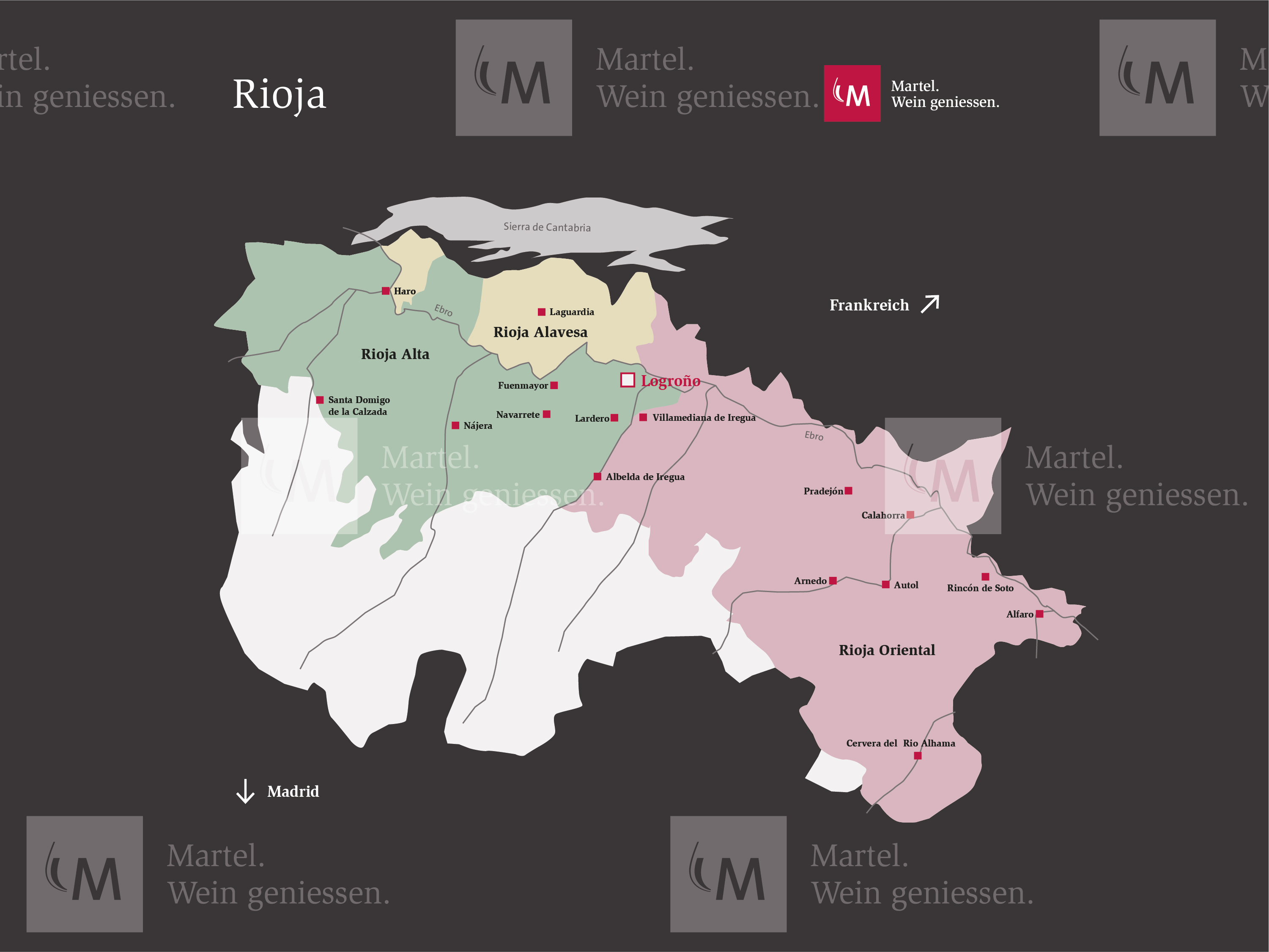 Der Name ist abgeleitet vom Rio Oja, einem Nebenfluss des Ebro, das Zentrum von Rioja bildet die Hauptstadt Logroño. Das Weinbaugebiet teilt sich auf in Rioja Alta (umfasst den Teil des Ebro-Tals westlich von Logroño um die Stadt Haro), Rioja Alavesa (nördlich des Ebro in der baskischen Provinz Alava) und Rioja Oriental (die Aussenbezirke Logroños nach Süden und Osten mit den Städten Calahorra und Alfaro. Die Weinberge liegen in einer Höhe von 300 m bei Alfaro im Osten bis fast 800 m an den Hängen der Sierra de Cantabria im Nordwesten. Die durchschnittlichen Jahresniederschlagsmengen steigen dementsprechend von weniger als 300 mm in Rioja Baja auf über 500 mm in den oberen Zonen von Rioja Alta und Alavesa. Man hat hier selten unter klimatischen Extremen zu leiden, wie z.B. in Zentral- oder Südspanien.Nur in Rioja Oriental herrscht ein eher mediterranes Klima, im Sommer steigen die Temperaturen hier häufig auf 30 – 35 Grad.